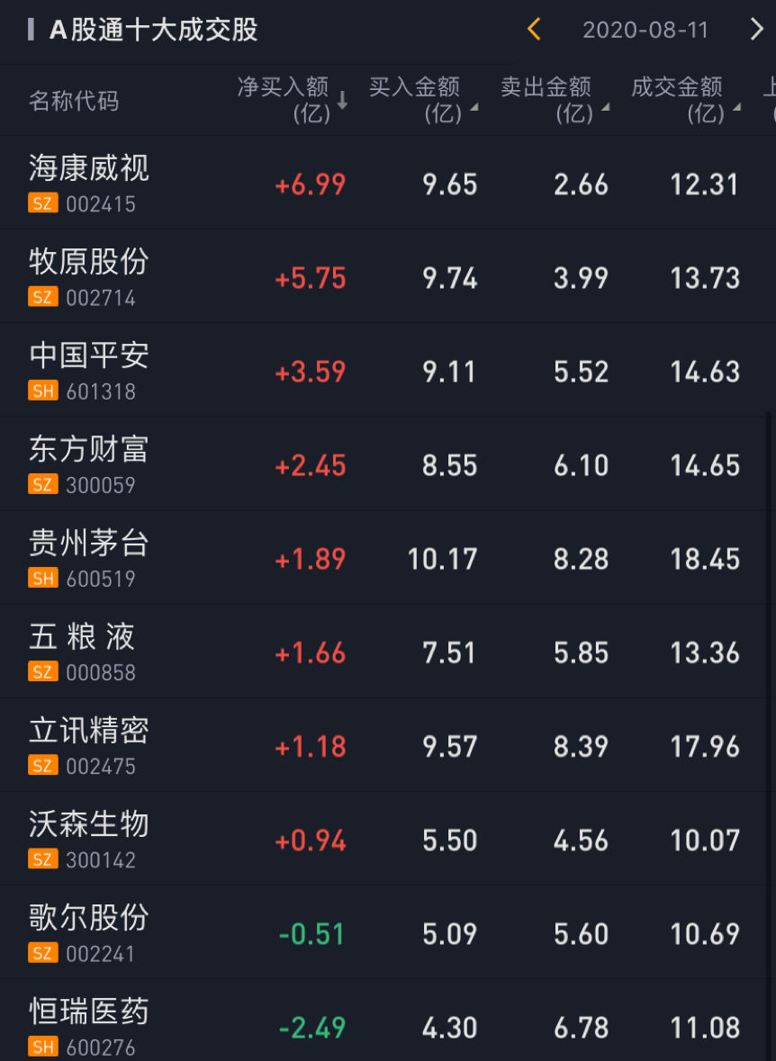北上资金今日净买入海康威视6.99亿元,净买入牧原股份5.75亿元,净买入中国平安3.59亿元,净买入东方财富2.45亿元。