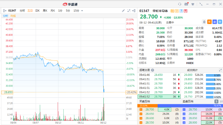 华虹半导体今日大跌13%,报价28.7港元。华虹半导体2020财年中期盈利3814万美元,同比下降58.01%;营业收入4.54亿美元,同比下降0.77%。毛利率由31.6%下降8.0个百分点至23.6%。