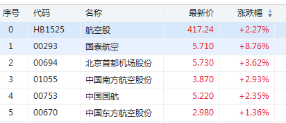 航空股逆市上扬,截至发稿,国泰航空(00293)涨8.76%,报5.71港元;首都机场(00694)涨3.62%,报5.73港元;南方航空(01055)涨2.93%,报3.87港元;东方航空(00670)涨1.36%,报2.98港元。