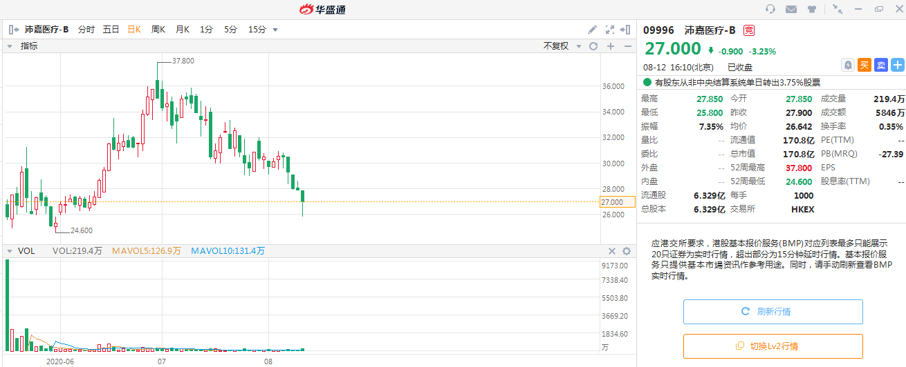 而另外一只沛嘉医疗,近期回调幅度较大,今年以来截至8月12日收市股价最大涨幅为53.7%。但由于其为今年2020年5月上市,发行价仅为15.36港元,相较3个月的高价37.8港元,一度涨幅也达到146%!