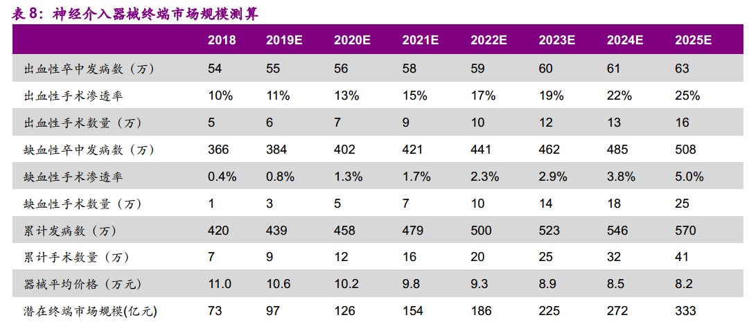 在2018年我国缺血性卒中发病数为366万,符合出血性卒中手术特征的发病数有54万,预计到2025年脑卒中发病人数全国将达570万人。经过业内专家测算,在2025年神经介入医器械的潜在终端市场规模将达333亿元。