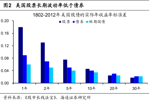 根据《股市长线法宝》,分析1802年以来持有期间在1-30年的美国股票、长期债券、短期国债实际收益率数据,从标准差来看,持有期为10年的股票、长期债券、短期国债实际收益率标准差分别为0.045、0.040、0.035,股票风险略高于债券,而当持有期拉长到20年时标准差分别为0.025、0.030、0.025,股票风险已经低于债券。