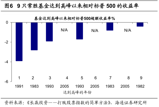 年收益率超过标普500指数2个百分点的基金数量更少,只有9只,占比仅为2.5%。在这9只长胜基金中,其中6个属于小型基金,这些基金的靓丽业绩吸引资金蜂拥而至,基金规模逐步膨胀,然而,正如巴菲特所言,“大钱包是超额收益的最大敌人”,随着规模的壮大和时间的流逝,这6只基金业绩也走上了下坡道。