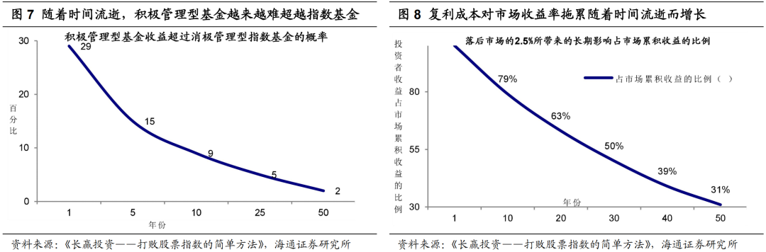 博格做了个蒙特卡洛模拟,假设指数基金年均成本率为0.25%,积极管理型基金的年均成本率为2%,模拟结果显示,按1年期计算,29%的积极管理型基金收益率超过指数基金,5年期为15%,10年期为9%,25年期为5%,50年之后,仅有2%的积极管理型基金能超过指数型基金。高昂的成本导致积极型管理基金随着时间流逝越来越难战胜指数性基金。