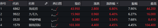 餐饮股集体飙升,海底捞飙升7%,九毛九涨6.4%,呷哺呷哺涨超5%。浙商证券近日发布研报称,餐饮股上半年业绩预告亏损与食品安全负面影响已反映在股价上;优质连锁龙头把握卫生事件下店铺出清机遇,逆势加速开店,其中海底捞三四线下沉展店超预期。