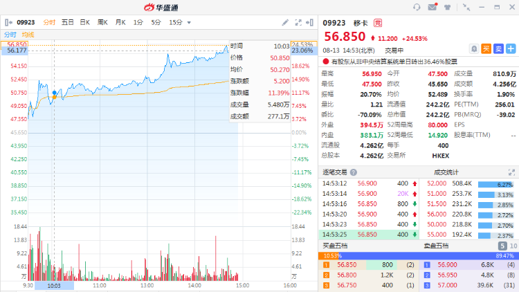 8月13日消息,移卡午后涨幅扩大至24.53%,报价56.85港元,市值242.2亿港元,此前两日暴跌32%,市值蒸发91亿港元。
