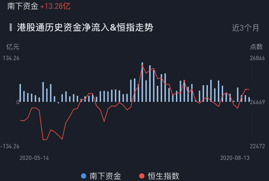 华盛资讯8月13日讯,南下资金今日净流入港股13.28亿港元,较上一交易日略微下滑。