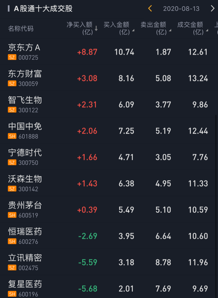 北上资金今日加仓京东方A近9亿元,加仓东方财富超3亿元,加仓智飞生物、中国中免超2亿元;卖出复星医药、立讯精密超5亿元。