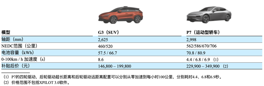 两款车型的定位和售价覆盖不同类型的消费者,其中G3补贴后售价在14.5-19.9万之间,P7补贴后售价在22.9-34.9万之间。