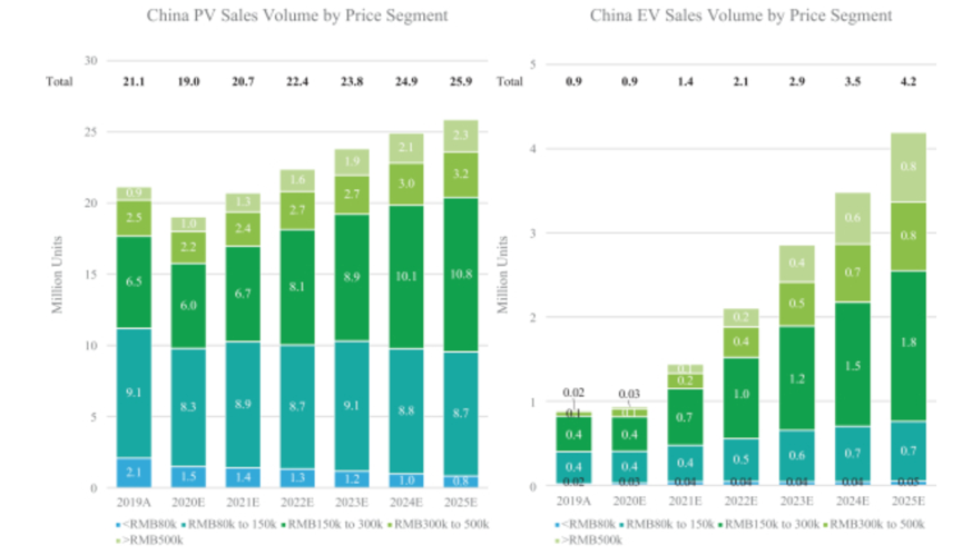 中高端市场预计将从2019年的650万辆增长到2025年的1080万辆,并将成为中国乘用车市场最大的细分市场。在中国电动汽车市场中,中高端市场最大,2019年占其销量的47.2%。预计该市场将保持最大,到2025年将达到180万辆。