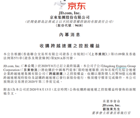 京东8月14日早间在港交所公告称,子公司京东物流将收购综合速运企业跨越速运集团,总对价30亿元,交易预计将于三季度完成。