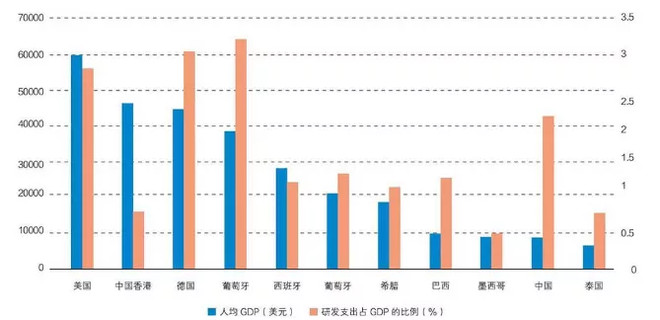 图11 不同国家(地区)人均GDP和人均研发支出对比