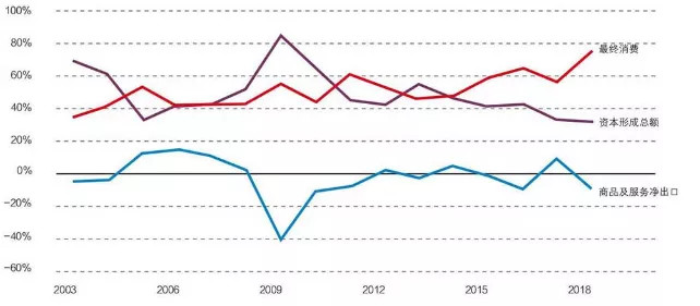 图6 中国2003—2018年最终消费、投资和商品及服务净出口对GDP增长的贡献率