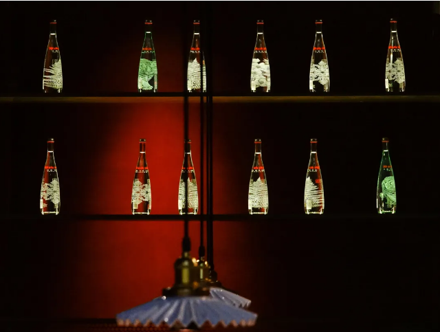 不同于2块钱的红瓶盖农夫山泉天然水的塑料瓶,45块的农夫山泉矿泉水盛放在水滴型的玻璃瓶里。瓶身上精致地绘制着水源地长白山的各种典型动植物的形象——东北虎、马鹿、飞翔的鹗、中华秋沙鸭以及山楂海棠、红松、野生蕨类和雪花[8]。