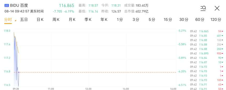 华盛证券8月14日讯,尽管营收、净利均超市场预期,百度(BIDU)开盘仍大跌超6%。截至发稿,百度跌6.19%,报116.86美元,当前总市值402.79亿美元。