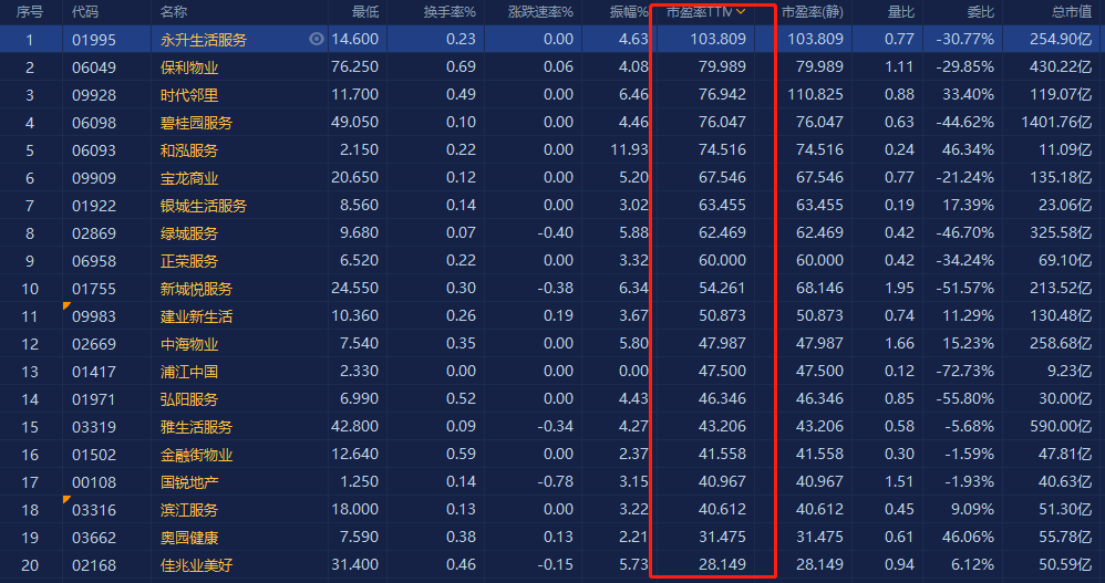 首先我们可以看到,物管公司静态估值已经很贵了,绝大部分都在40pe以上,头部玩家都是70倍往上数。(以后还有谁敢说港股估值低?)