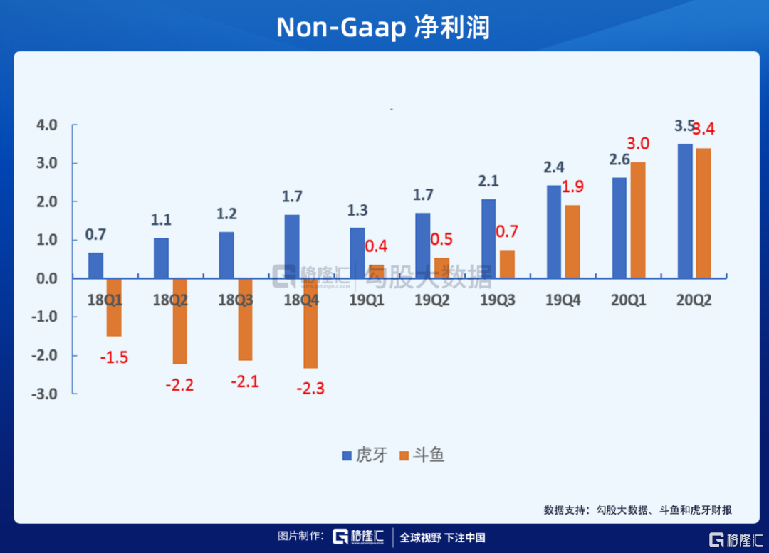 在盈利绝对值上,斗鱼只用了一年时间就实现了从严重亏损到盈利的华丽转身。二季度Non-GAAP净利润高达3.4亿元。虎牙Q2Non-GAAP净利润也创下了上市以来的新高3.5亿元,在利润绝对值上两家公司不相上下。