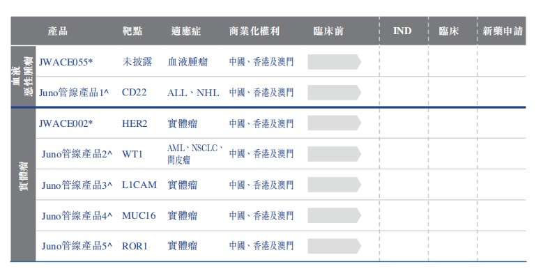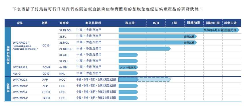 其他候选产品也包括:JWCAR129是以在MM中表达的BCMA为靶点的CAR-T产品;下一代(「Nex-G」)抗CD19候选产品;JWATM203是临床前阶段及潜在同类首创以AFP为靶点治疗HCC的TCRmT细胞疗法;JWATM204是以GPC3为靶点的新型T细胞疗法候选产品。