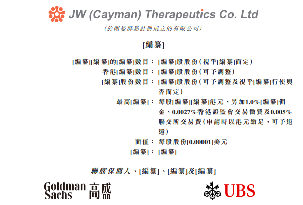 据港交所8月14日披露,JW(Cayman) Therapeutics Co.Ltd(药明巨诺)向港交所递交上市申请,高盛和瑞银为联席保荐人。
