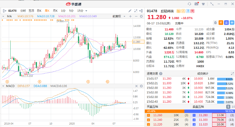 丘钛科技午后急升逾10%,截至发稿,涨10.37%,报11.28港元,成交额2.019亿港元。