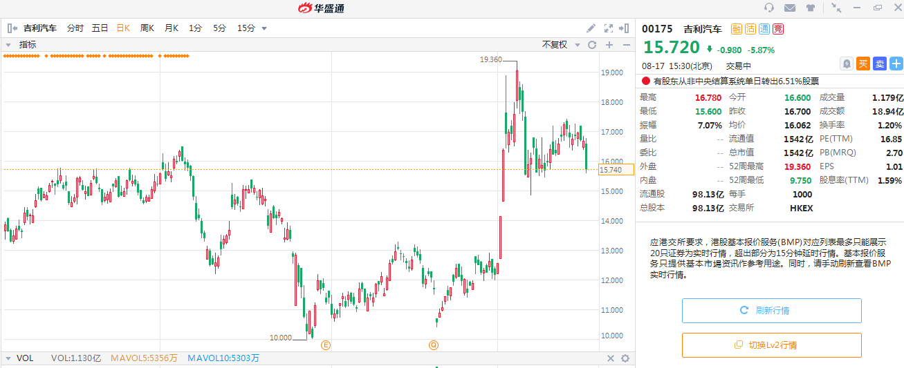 此前吉利发布了上半年业绩预告,公司预计上半年归母净利润同比下降约40%。公司称,净利润减少原因主要是由于中国市场汽车整体销量下跌超出预期及吉利集团主动减少经销商总库存。