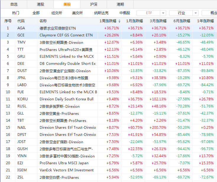 上周美股ETF总体表现较平,除了爆冷大涨26.26%窜上涨幅榜首位的多元化投资组合GCE(AGA已退市),表现较好的ETF就大致围绕着做空美国长期国债、做空黄金白银、做空标普生物技术股以及做多日本韩国、俄罗斯和中国股市的ETF。