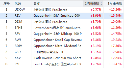 尽管经历了一定的小波折,但美股上周整体上涨,并且不同于前一周的中小盘股领涨,上周大盘股重新夺回先锋地位,3倍做多道指的UDOW涨幅最佳,达到5.57%,近一个月累涨15.26%。