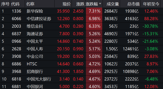 金融板块集体走高,新华保险涨超7%,中国太平、中国人寿涨超5%;中信建投打仗啊7%,海通证券涨超5%,华泰证券、中金公司涨5%。
