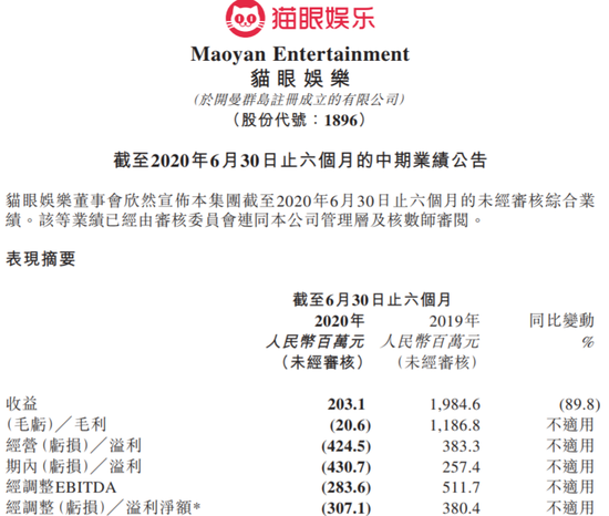 8月17日,猫眼娱乐发布2020年上半年财报。猫眼娱乐2020年上半年实现收益2.03亿元;期内亏损净额为人民币4.3亿元,经调整EBITDA为人民币-2.8亿元,在国内电影市场、现场娱乐市场受到疫情冲击的情况下,体现出了较好的风险抵抗能力。