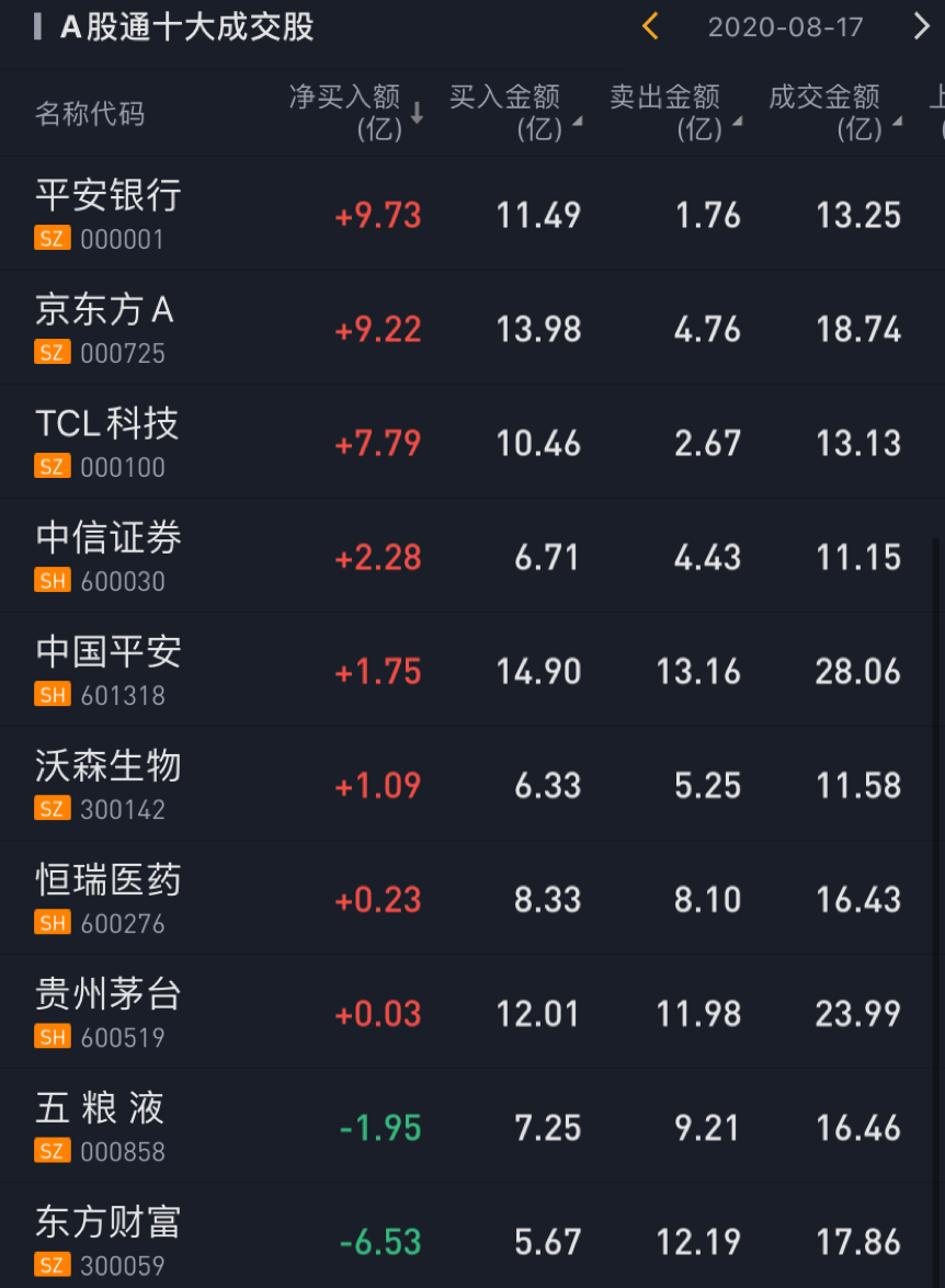 北上资金今日净买入平安银行9.73亿元,净买入京东方A9.22亿元,净买入TCL科技7.79亿元。此外,今日北上资金净卖出东方财富6.53亿元。