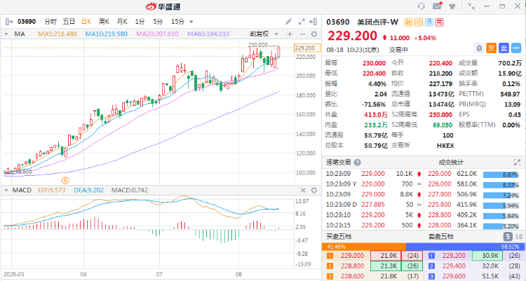 美团点评-W早盘续涨逾5%,截至发稿,涨5.04%,报229.2港元,成交额15.9亿港元。