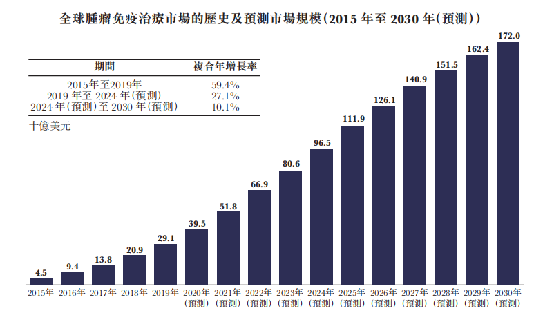 过往数年间,肿瘤免疫治疗革新癌症治疗。肿瘤免疫治疗旨在激活患者自身的免疫系统,以产生或增强抗肿瘤免疫应答去控制或消灭癌细胞。由于肿瘤免疫治疗能够提供持久的缓解,且部分晚期癌症患者对此通常具有良好的耐受性,该治疗的发现及发展已成为全球癌症疗法的重要里程碑。肿瘤免疫治疗的主要类别包括细胞免疫治疗、检查点抑制剂、治疗性癌症疫苗及细胞因子。全球肿瘤免疫治疗市场近年显著扩展,预计在未来数年内将以更快的速度进一步扩展。
