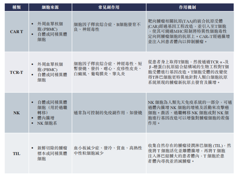 细胞免疫治疗,亦称为过继细胞(ACT)治疗,是一种将免疫细胞(主要为T细胞)注入患者以治疗癌症的免疫疗法。 T细胞通常取自患者自身的血液或肿瘤组织,并在实验室大量培育,然后再输入患者体内以帮助免疫系统杀死肿瘤细胞。细胞免疫疗法的主要类别包括CAR-T、TCR-T、NK及TIL。下表概述其细胞来源、常见副作用及作用机制。