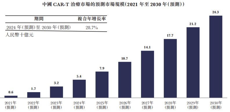 根据弗若斯特沙利文的资料,由于对可使用CAR-T疗法进行有效治疗的需求仍未被满足,中国CAR-T治疗市场规模预期由2021年的人民币6亿元增至2024年的人民币54亿元,并进一步增至2030年的人民币243亿元。