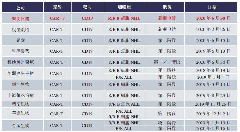 药明巨诺的主打候选产品Relmacabtagene autoleucel是针对复发或难治B细胞淋巴瘤的抗CD19 CAR-T疗法,且国家药监局已于2020年6月受理审查药明巨诺将relma cel用作DLBCL三线疗法的新药申请。 Relma-cel有望成为中国首个获批的一类生物制品CAR-T疗法,并有望成为同类最佳CAR-T疗法。
