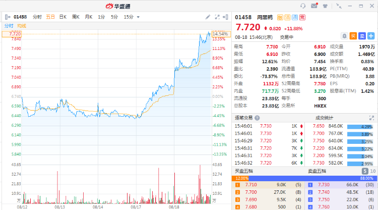 华盛资讯8月18日讯,周黑鸭今日一度涨超12%,股价创今年新高,目前涨11.88%,两日累涨20%。该股已较今年股价低点翻倍。