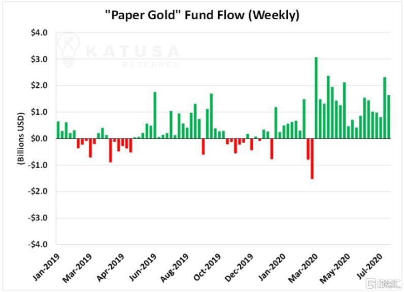 实物黄金ETF是基金买卖黄金最具流动性的方式,自2020年3月中旬以来,每周都有大量的购买活动。