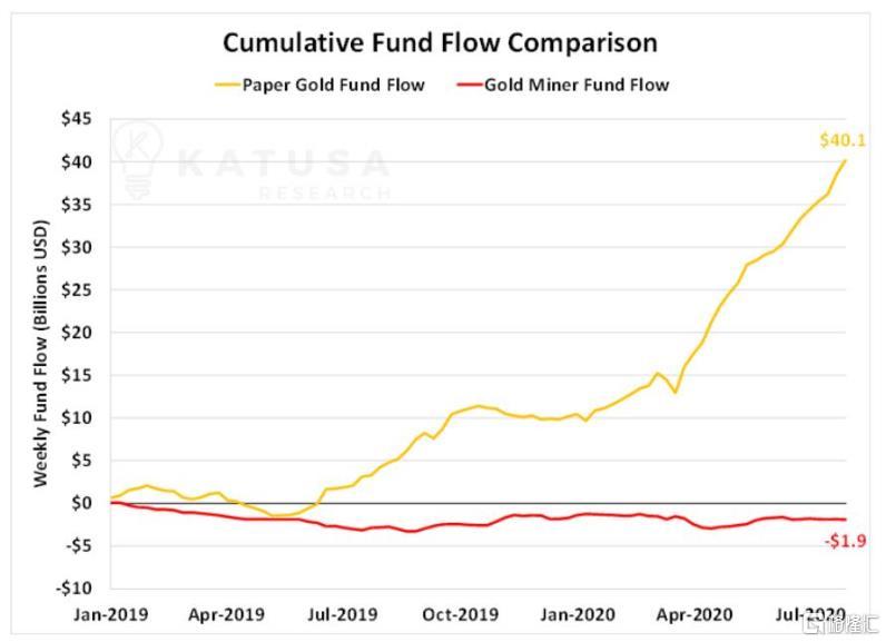 但总体来看,投资者对纸黄金和黄金股 ETF 的实行了极大的差别对待,下图显示了从2019年1月至今,纸黄金市场和黄金矿业股板块的累计资金流入,纸黄金的资金流入节节攀升,而金矿股ETF的资金流入不升反降。