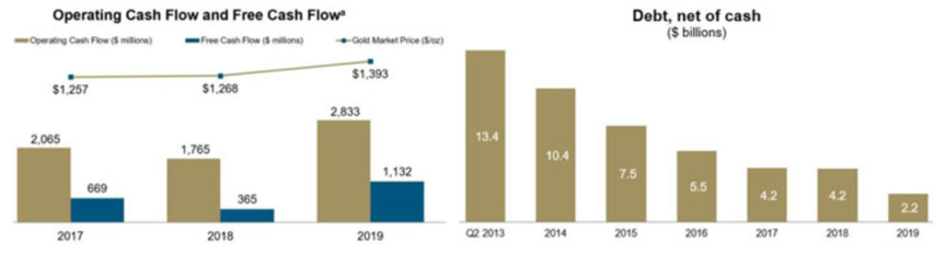 除了ROE之外,巴里克近年的经营现金流、自由现金流整体均呈上升趋势,而负债净额持续下降。截至2019年,巴里克黄金自由现金流达到11.32亿美元,经营性现金流达到28.33亿美元,负债净额从2013年Q2的134亿美元下降至2019年年底的22亿美元,资产结构持续优化。