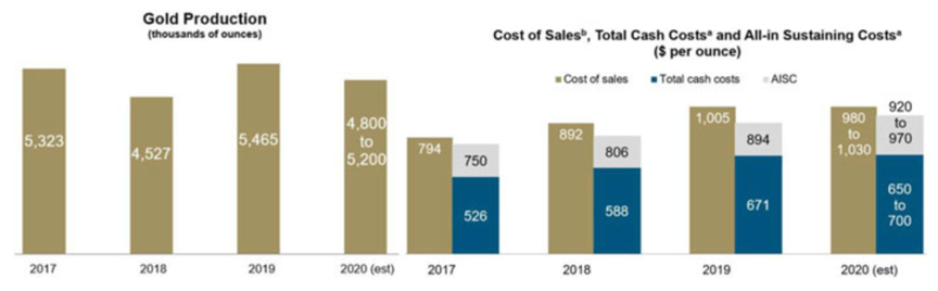 从历史数据来看,巴里克的黄金产量在过去数年相对稳定,在532.3-546.5万盎司之间波,并预期2020年黄金产量将在480-520万盎司间,略微低于2019年产量。