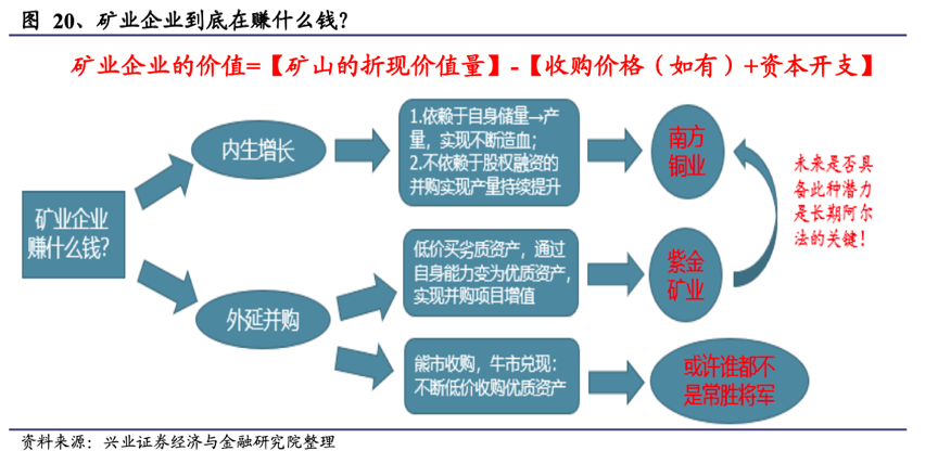 内生增长的逻辑,主要依赖矿业的自身储量和产量,实现不断造血。这种模式不依赖于股权融资的并购,但是产量的持续提升一方面需要高水平的管理,一方面也与矿质的高低有关。