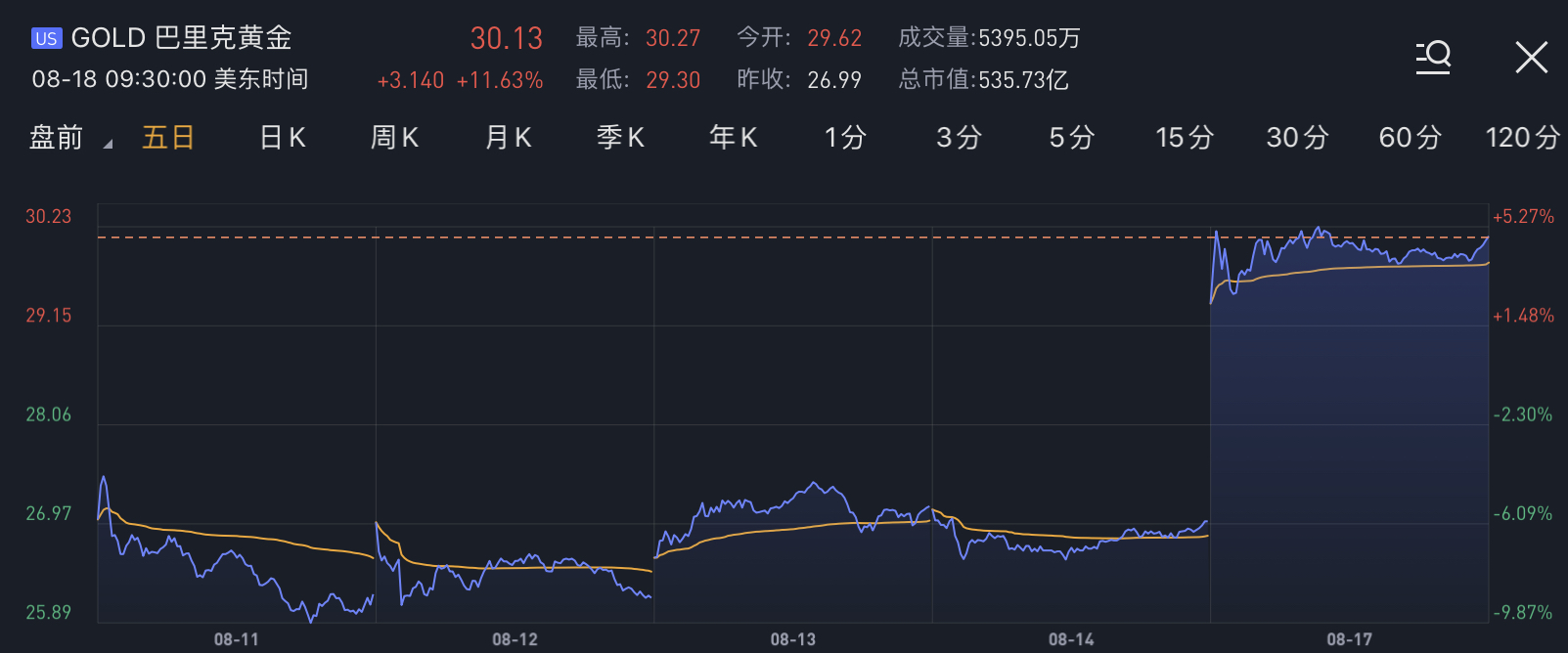 受巴菲特买入消息刺激,8月17日截至收盘,巴里克黄金收涨11.63%,报30.13美元。