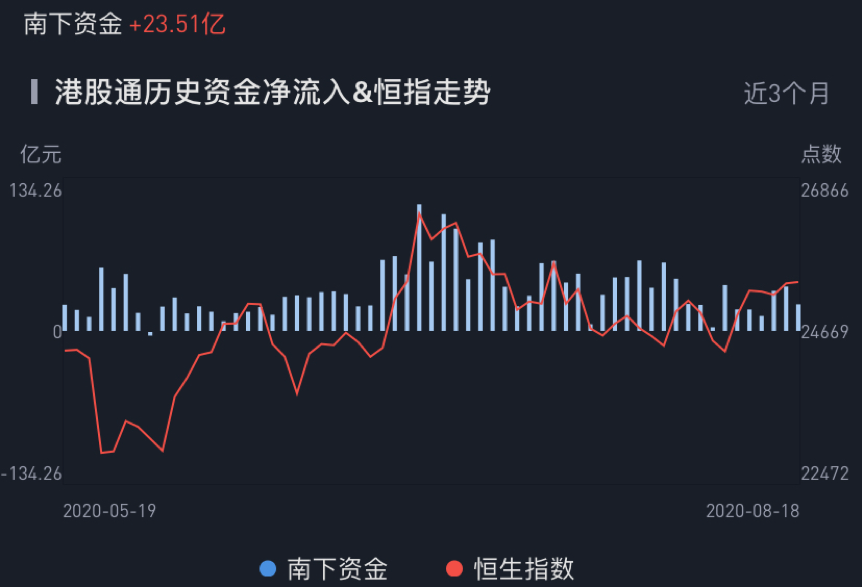 华盛资讯8月18日讯,南下资金今日净流入港股23.51亿港元,较昨日有所下滑,但资金的长期持续流入趋势未改,显示出港股当前全球估值洼地的吸金能力!