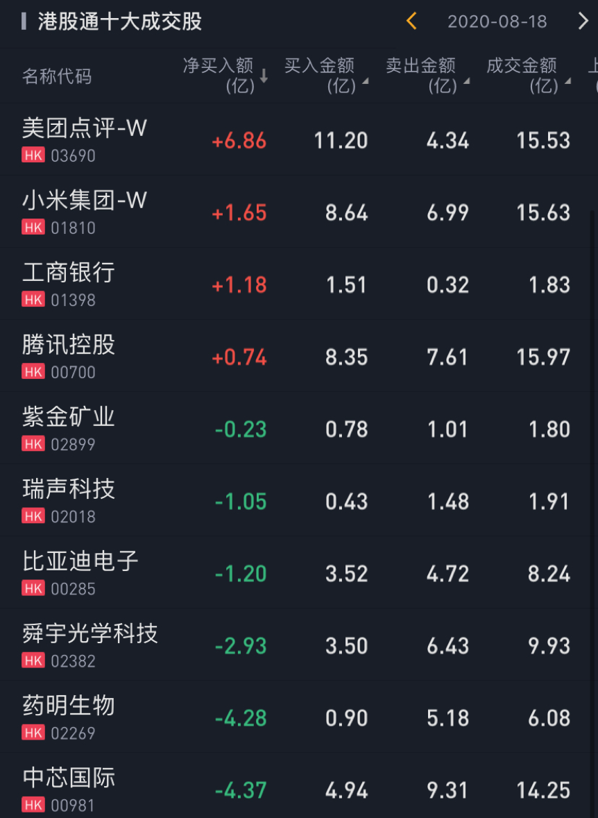 个股方面,今日南下资金净买入美团点评6.86亿港元,净买入小米集团1.65亿港元,净买入工商银行1.18亿港元,净买入腾讯控股0.74亿港元。