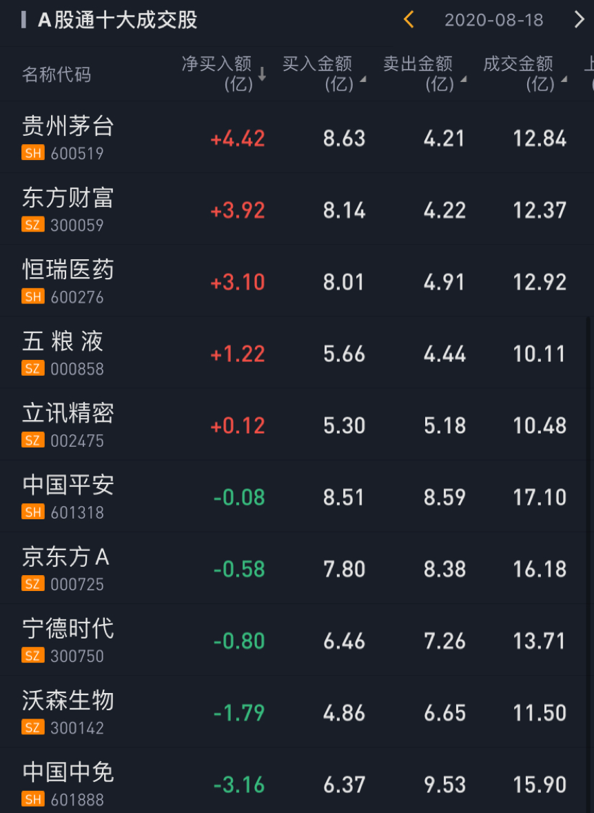 北上资金今日净买入贵州茅台4.42亿元,净买入东方财富3.92亿元,净买入恒瑞医药3.10亿元。此外,今日北上资金净卖出中国中免3.16亿元。