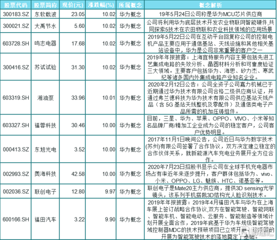 当天华为概念股上涨的个股数量与下跌的数量基本持平,共有10只华为概念股涨停。