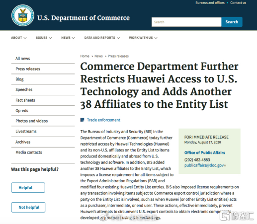 标题:《商务部进一步限制华为获取美国科技,并将38家(华为)关联企业加入“实体清单”》