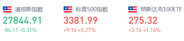 美股周一早盘道指倒跌,盘中科技股助推纳指创新高,标普500指数逼近新高。截至收盘,道指跌86.11点或0.31%,报27844.91点;纳指涨110.42点或1.00%,报11129.73点;标普500指数涨9.14点或0.27%,报3381.99点。