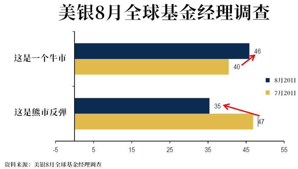 美银的Michael Hartnett等策略师表示,美银8月全球基金经理调查结果显示,当前基金经理的看涨情绪为2020年2月以来最强,但是他们的持仓并未达到“极端危险看涨”的地步。整体来看,基金经理们对股市和经济的看法更显乐观了。该调查中有46%的投资者表示“这是一个牛市”,高于7月调查时的40%。受访者认为长期牛市是股市价格上涨的主要原因,未来可能会有短暂的回调。