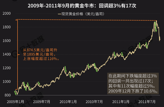不过参照历史数据来看,投资者也不必过于恐慌,金十vip报告指出,黄金在牛市中的大幅回调是比较正常的。在2009-2011年的上一轮金牛中,回调幅度超过3%的有17次。